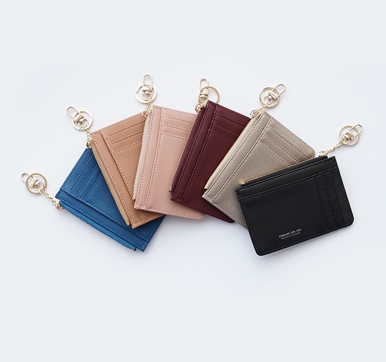 Main Features: Logo: Forever For You Size: 12cm*8.5cm*0.3cm Weight: 50g/pcs High Quality PU Leather Fashion Zipper Design Cross Pattern With Card holder,Coin holder Sturdy Metal Buckle High quality zip hardware Precision Sewing Line Best gift choice for your family,lover and friends 6 colors for you choice