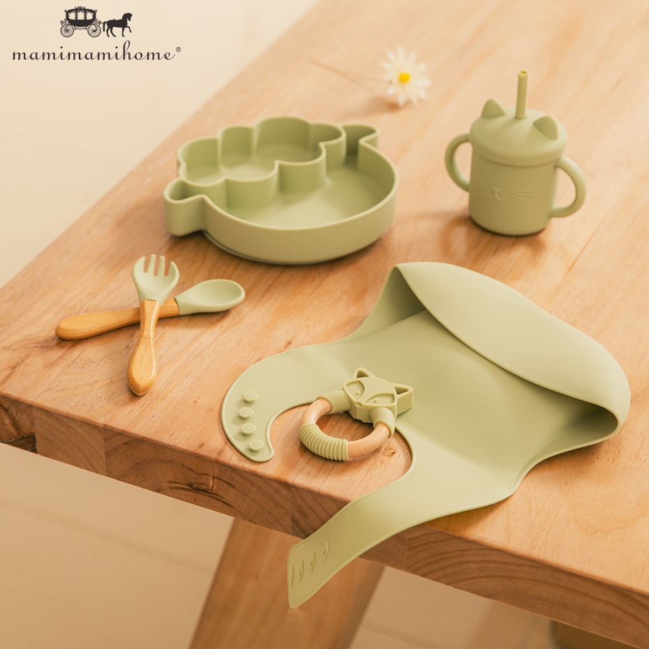 Mamimami Home Baby Feeding Set 6pcs 100% Soft Silicone Bib,Sippy Cup,Suction Plate with Box Best Kids Gift