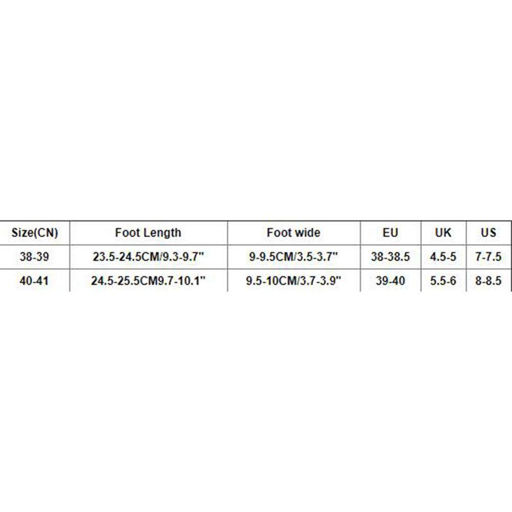 Size(CN):38-39 Foot Length:23.5-24.5CM/9.3-9.7" Foot wide:9-9.5CM/3.5-3.7" EU:38-38.5 UK:4.5-5 US:7-7.5