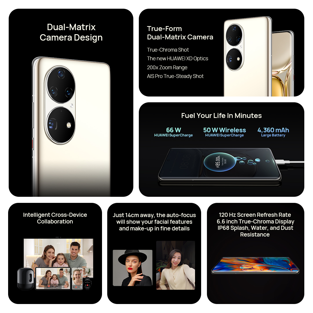 HUAWEI P50 Pro delivers superior performance and push the boundary of smartphone photography. True-Form Dual-Matrix Camera enables you to capture what you see with original colours and elevated clarity. The upgraded portrait mode and new AI features help you create stories with great fun. The supreme iconic design “Legend Reborn”apply on the Dual-Matrix Camera. Intelligent Cross-Device Collaboration, Smart Folder provides the all-new interactive experience, Fitting the large screen and battery into a compact body, HUAWEI P50 Pro is lighter than the previous generation and a better fit in your hand which contains 66W wired and 50W wireless super charge with the 4360mAh battery