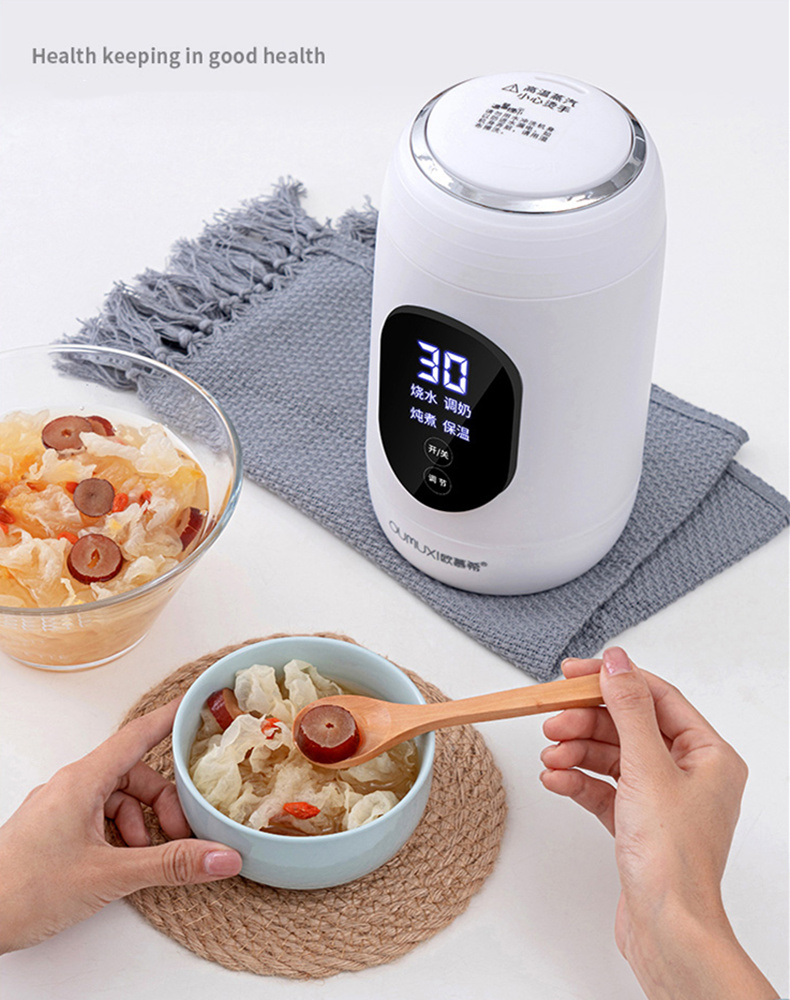 ﹏﹏﹏﹏﹏﹏﹏﹏﹏﹏﹏﹏﹏﹏﹏﹏﹏﹏﹏﹏﹏﹏﹏﹏﹏﹏﹏﹏﹏【A】※※Product Overview※※ 1.Small size, easy to carry; 2.The handle can be folded to save space. 3.Intelligent temperature control, Multi-function.﹏﹏﹏﹏﹏﹏﹏﹏﹏﹏﹏﹏﹏﹏﹏﹏﹏﹏﹏﹏﹏﹏﹏﹏﹏﹏﹏﹏﹏【B】※※Basic Product Parameters※※ 1.Model:DQ-V008; 2.volume: 0.7L; 3. Product size: about22cm*12cm; 4.Rated Voltage: 220 V; 5.Rated Power: 600 W; 6. Color: white; 7. Stew: with or without(Optional purchase) 8. Security authentication: CCC(China Compulsory Certification)﹏﹏﹏﹏﹏﹏﹏﹏﹏﹏﹏﹏﹏﹏﹏﹏﹏﹏﹏﹏﹏﹏﹏﹏﹏﹏﹏﹏﹏【C】※※Function and operation※※ ●Functional description: 1.Boiling water: heating to 100℃(display screen:00) → 60℃ holding for 12 hours → shutting down; 2.Milk mixing: 42℃ constant temperature for 24 hours → shutdown; 3.Stewing: heated to 100℃ (display screen:00) → converted to low power intermittent heating for 60 minutes→60℃ holding for 12 hours → shutting down; (Press the adjusting key to set the timing) 4.keep warm: 60℃ for 12 hours → shutdown; (Temperature can be set by pressing the adjusting key) ●Operational instructions: 1.Switch key: Used as boot-up and shutdown 2.Adjustment key: click on the function that needs to be used (boiling water, milk mixing, stewing, keep warm). After the function is selected, the program starts to work in 5 seconds. After the program is locked, if you need to re-select the function, you can press the switch key and re-select it. 3.Temperature Selection: After the start of the function program of stewing or keep warm, the manual temperature adjustment can be carried out by pressing the adjustment key; the temperature intelligent adjustment of the function of boiling water or milk-mixing.﹏﹏﹏﹏﹏﹏﹏﹏﹏﹏﹏﹏﹏﹏﹏﹏﹏﹏﹏﹏﹏﹏﹏﹏﹏﹏﹏﹏﹏【D】※※Other notes※※ 1.Origin: China; 2.Operation Style: touch; 3.Population recommended: Office workers students travelers; 4.Heating style: chassis heating; 5.Scale Label: inner wall label; 6.Material: stainless steel; 7.Whether have insulation function: YES; 8.Whether have Overheat protection: YES; ﹏﹏﹏﹏﹏﹏﹏﹏﹏﹏﹏﹏﹏﹏﹏﹏﹏﹏﹏﹏﹏﹏﹏﹏﹏﹏﹏﹏﹏【E】※※Reminder※※ 1.Steam at high temperature, hot hands carefully; 2. Please wipe with wet cloth, do not wash with water, in order to prevent leakage of electricity caused by water intake into the fuselage. 3. Free gift: Universal Malaysia Plug Socket Adaptor