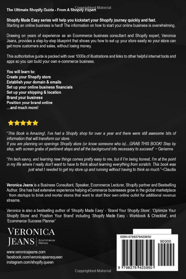 The first book in the groundbreaking Shopify Made Easy 2023 series, Start Your Online Business is an eye-opening and sweeping game plan for taking your ecommerce venture to the next level. If you like self-determination, fast-action approaches, and crystal-clear explanations, then you’ll adore Veronica Jeans’ guide to victory.